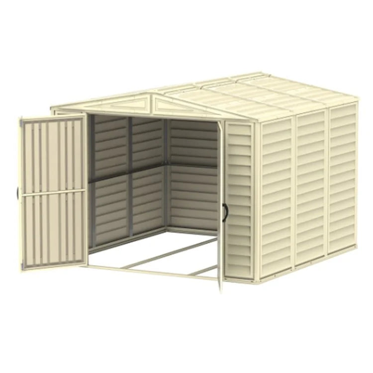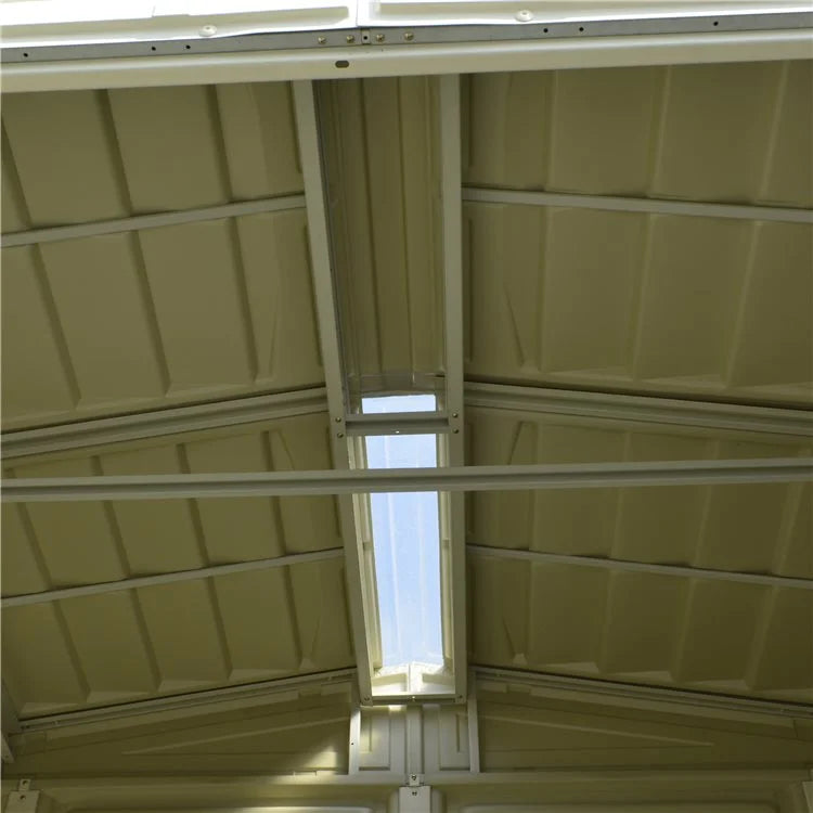 The Saffron Vinyl Shed provides reliable, low-maintenance storage with weather-resistant vinyl panels and a sturdy metal frame. Designed for convenience, it features a central skylight for natural lighting, a metal foundation kit, and secure, padlock-ready double doors. With its attractive ivory finish, this shed complements modern outdoor spaces and offers dependable storage year-round.