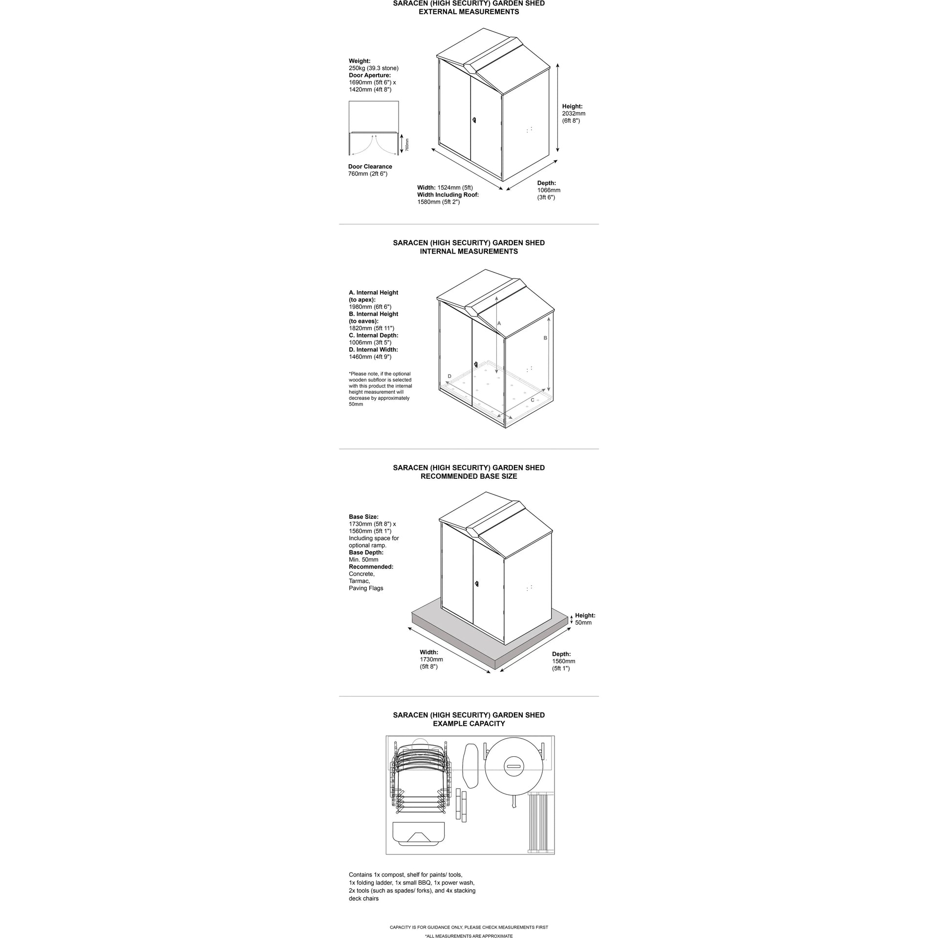 Compact Footprint – Maximum Security The Saracen is a compact garden shed built for big protection. Measuring 5ft x 4ft with an apex internal height of 6ft 6”, it’s the perfect size for walk-in access and storing valuable items like tools, BBQs, and ladders. Made from reinforced, galvanised steel and fitted with a metal floor, this heavy-duty shed is backed by police, locksmith, and LPCB certification.
