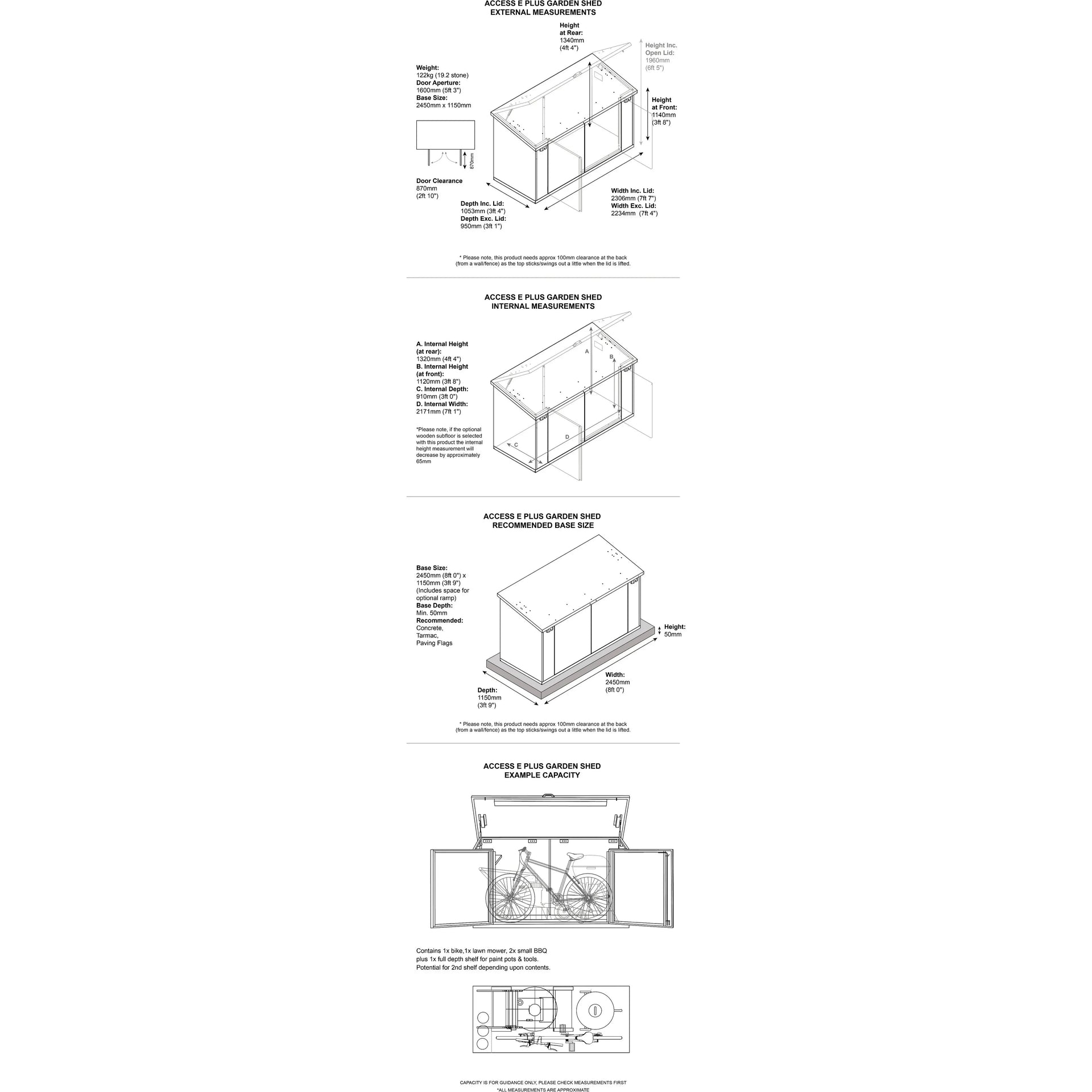 Garden Shed with Built-In Power Plate & Lift-Up Access The Access E Plus is a secure metal garden shed with the added benefit of internal power access. Built from reinforced galvanised steel and weighing 122kg (19 stone), this compact but spacious unit offers a gas-assisted lift-up lid, wide double doors, and an integral steel base—perfect for storing and charging gardening tools like mowers, hedge trimmers, and power tools.