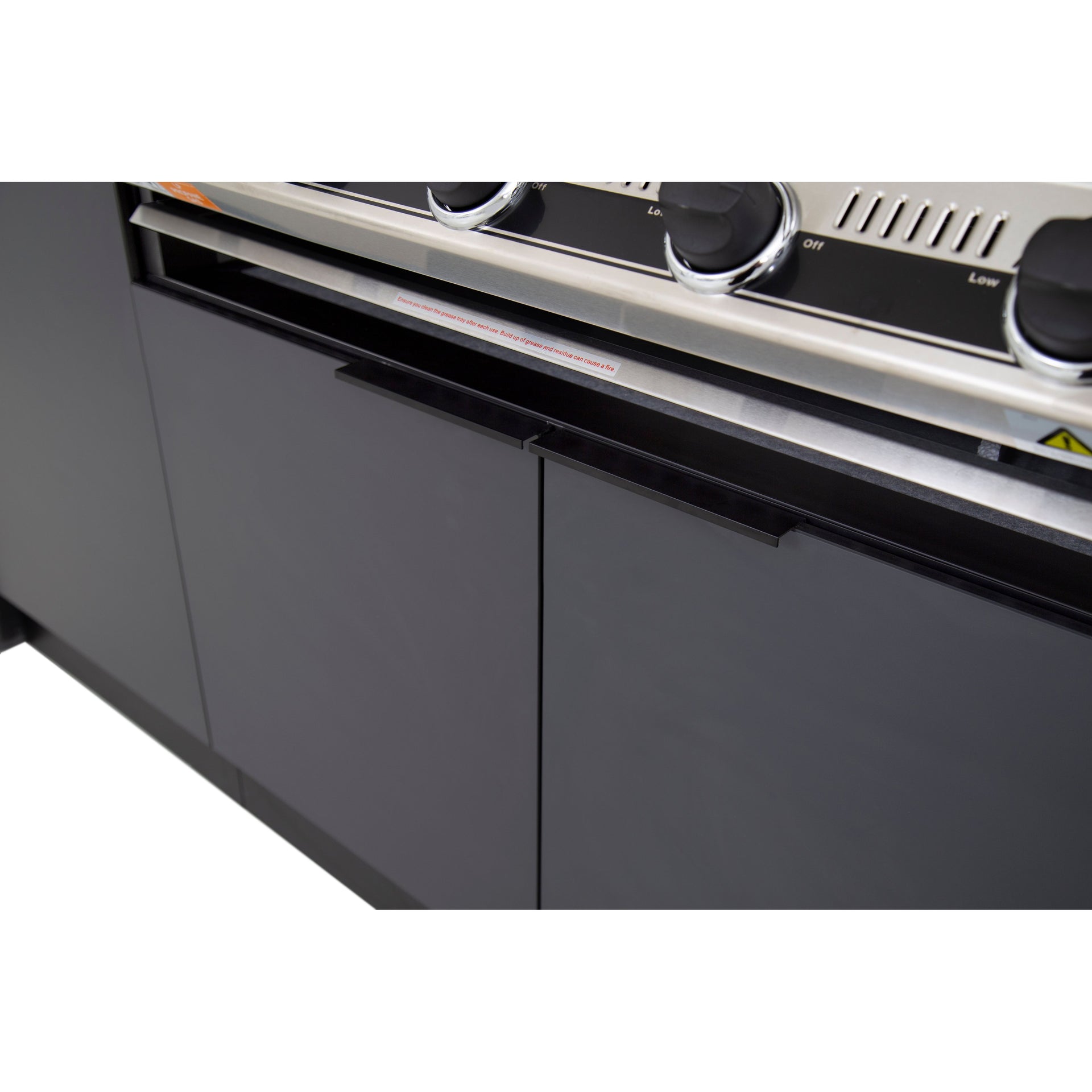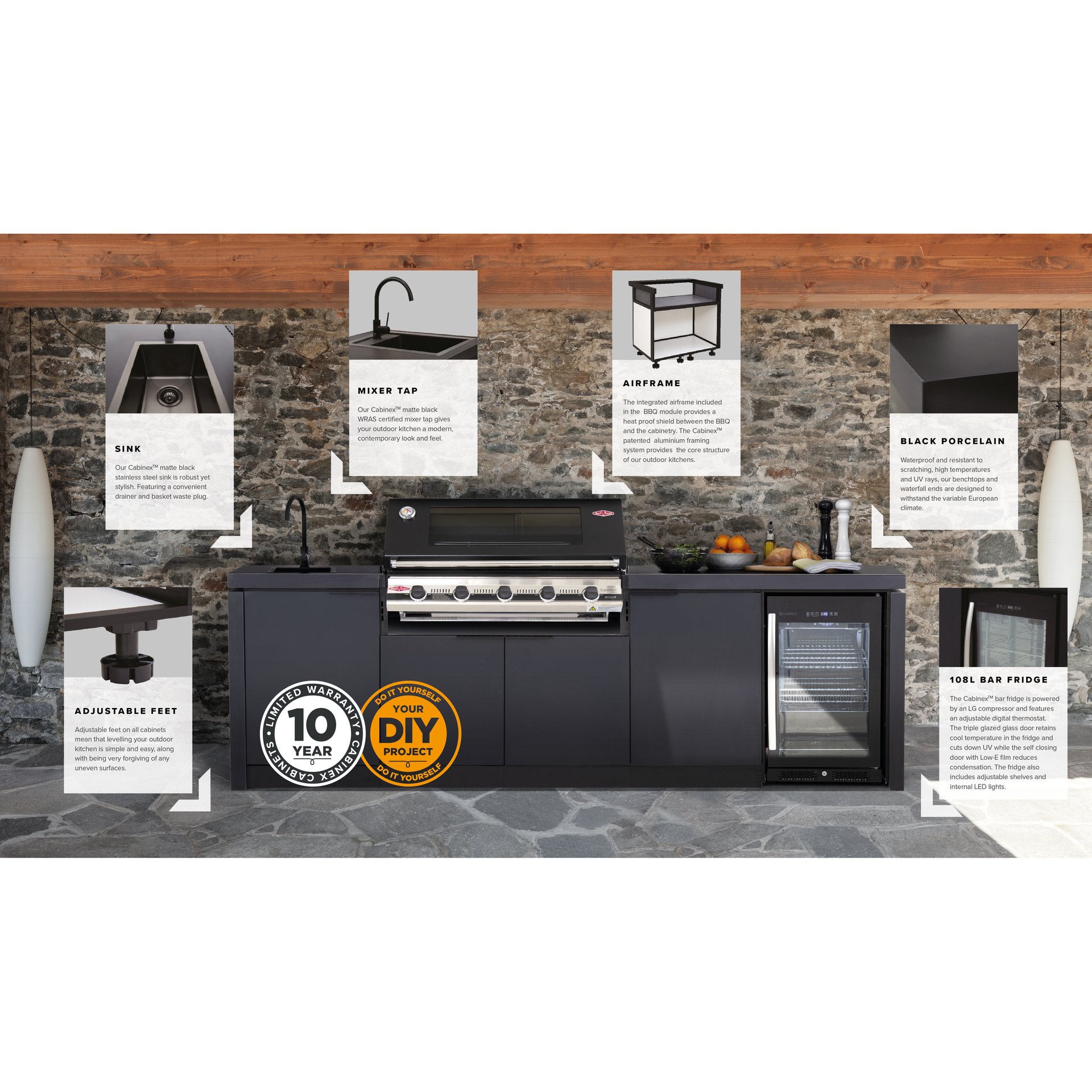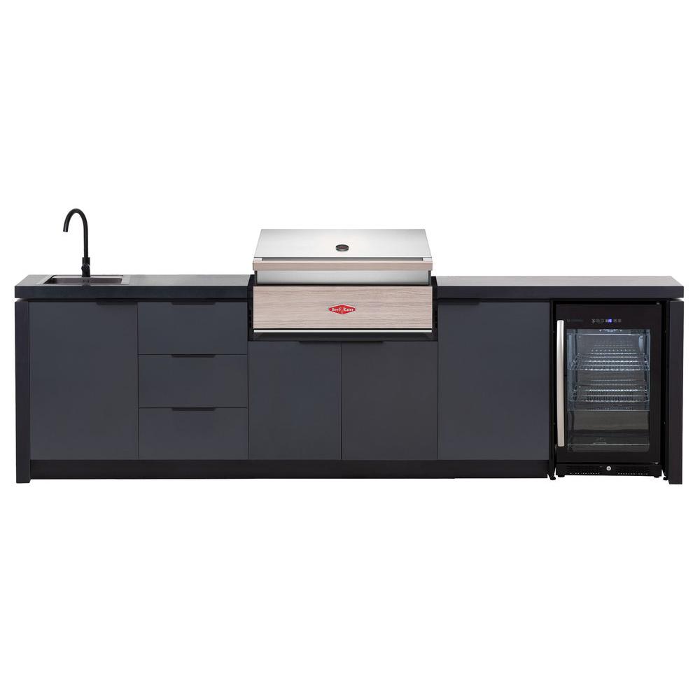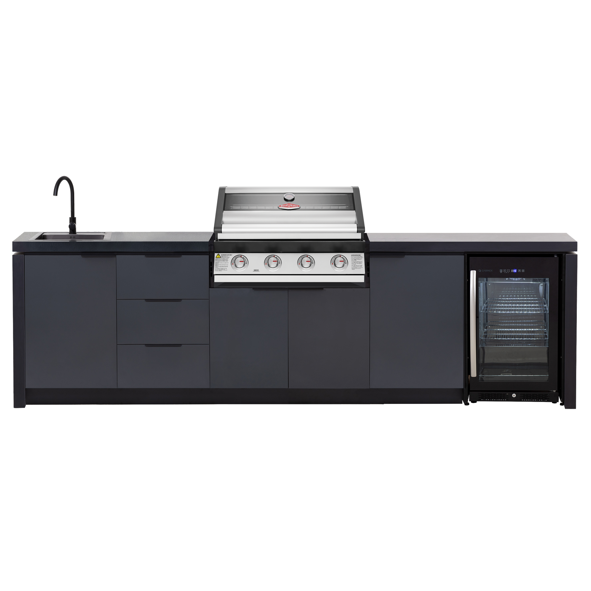 The BeefEater 4 Burner Outdoor Kitchen Premium Pack with a 1600S/ 1600E/ 1500/ 3000E/ 7000C/ 7000P BBQ and Fridge is designed to be a high-quality outdoor cooking and entertainment solution, with an emphasis on the BBQ.