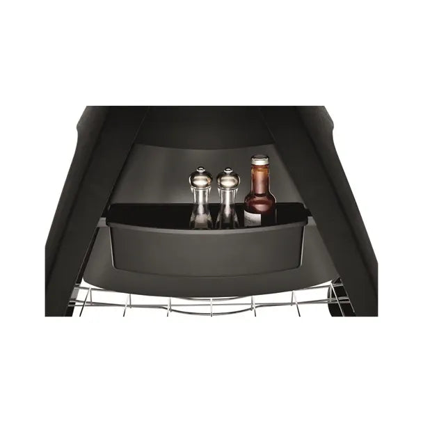 Integrated side shelves provide extra prep room and fold down when not needed. A large condiment tray keeps sauces and tools within reach, keeping your cooking station tidy and efficient.