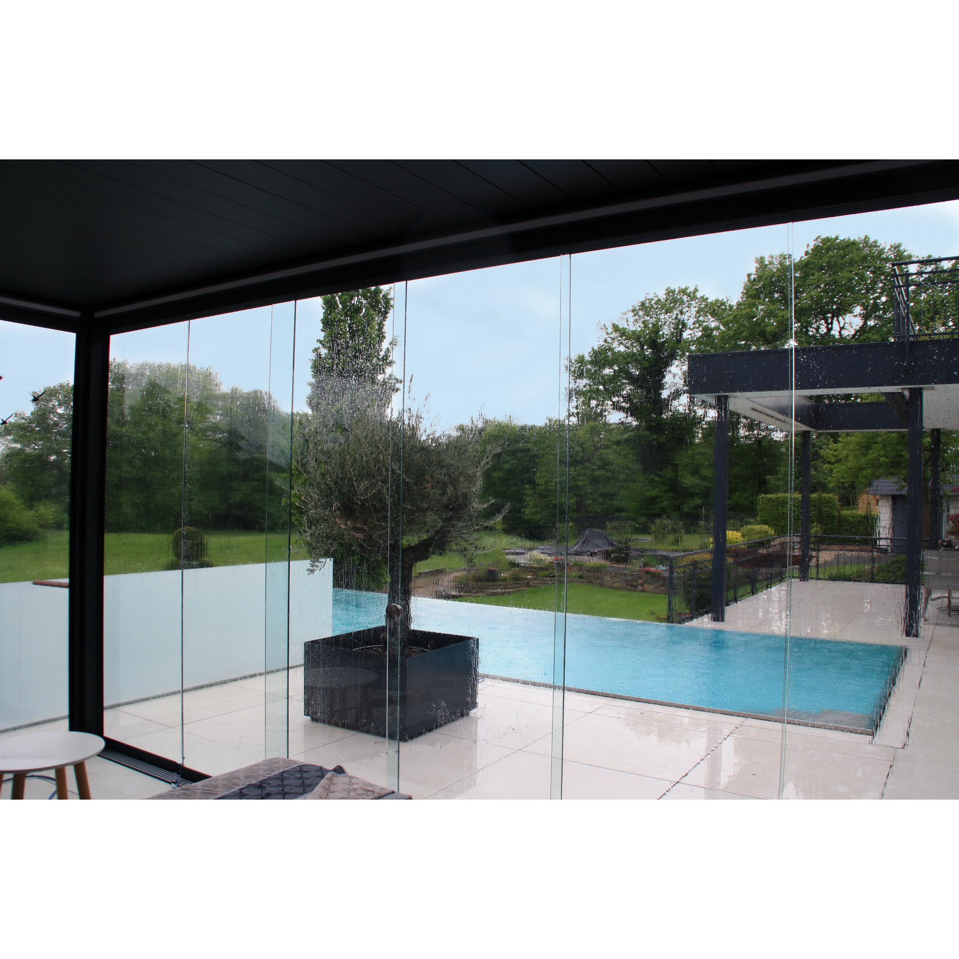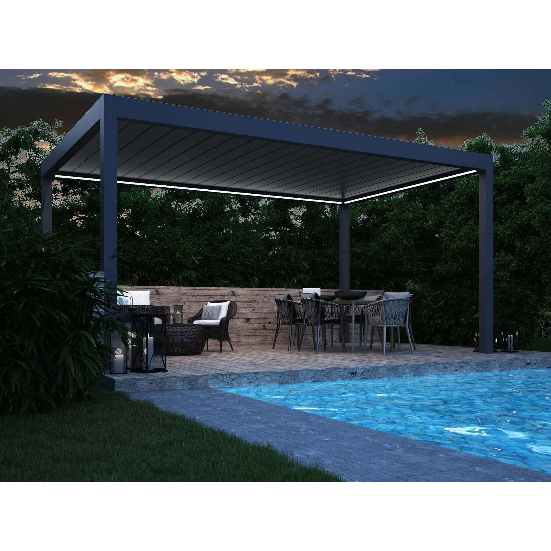 With the push of a button, open your terrace to enjoy the sun or close it up for full protection from rain or snow. The motorised louvre roof slides smoothly to one side using the SOMFY remote control, letting you customise your space with light or shade as needed. Add the optional LED strip lights for a soft, ambient glow in the evening—perfect for dining under the stars.
