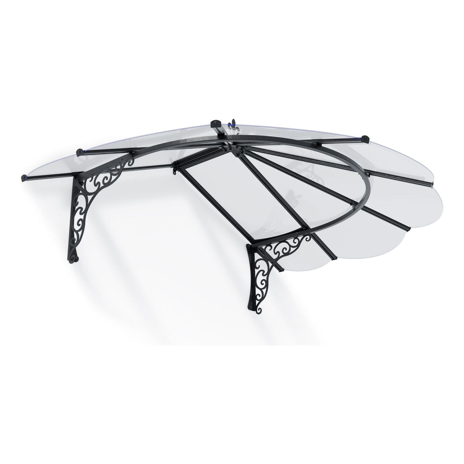 Elevate your home's entrance with the stylish Iris Door Awning. Featuring a sleek black aluminum frame and clear panels, this awning creates a bold statement while offering practical protection from the elements. Decorative galvanized steel brackets add a touch of elegance reminiscent of French antiques. Easy to install and built to last, the Iris Door Awning ensures long-term protection for your door and entryway, making a stylish addition to your home.