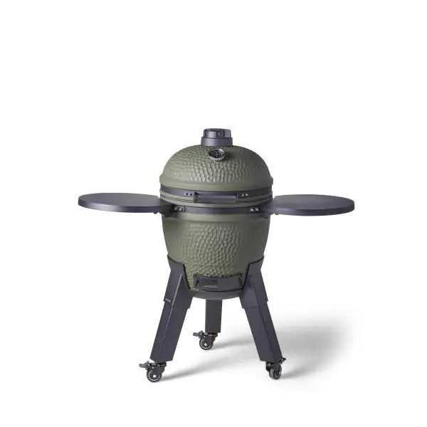 With its stunning matte Olive Green or sophisticated Midnight Black finish, this Kamado is a true eye-catcher in any garden or patio. The sturdy black aluminium base provides stable placement, while the built-in thermometer (resistant to condensation) and adjustable top and bottom ventilation allow for precise temperature control.