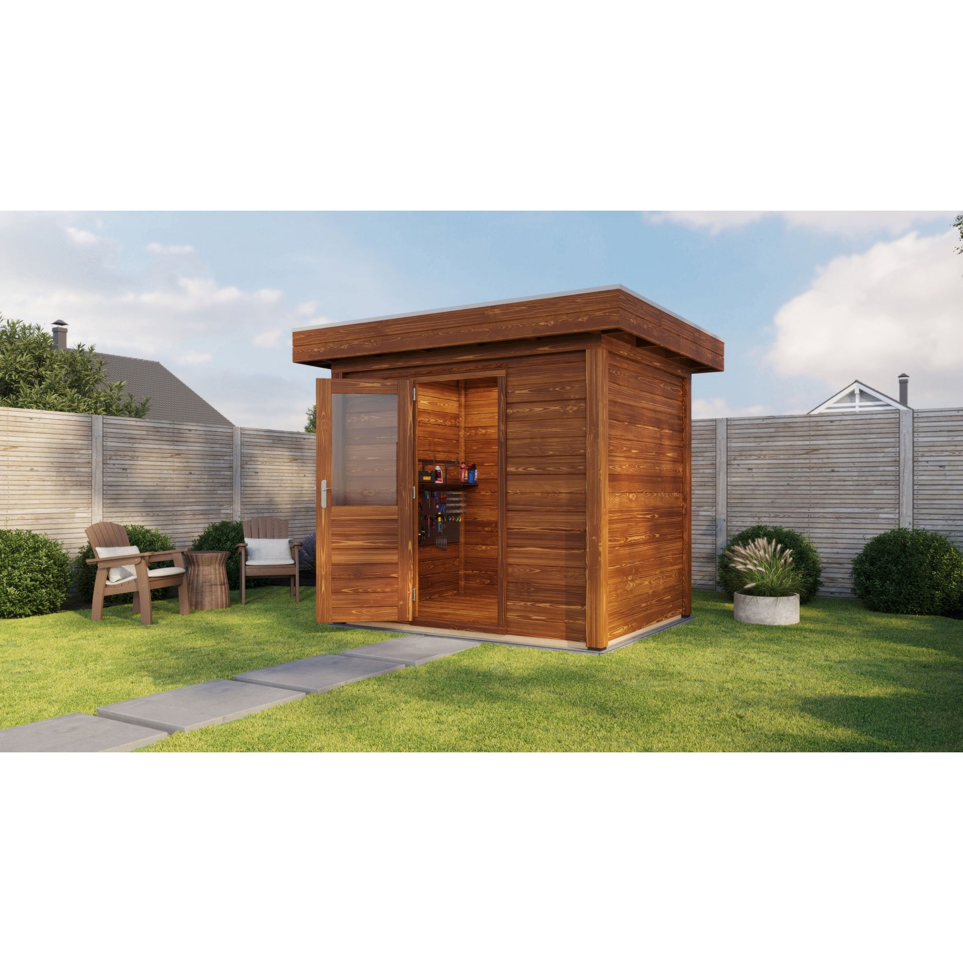 Create a stylish outdoor retreat with the Lugarde Select - Sheffield Modern Range Summer House, offered in untreated, brown oil, and black oil finishes. Made with 28mm kiln-dried spruce walls, this summer house provides excellent insulation and long-lasting durability. Its flat roof design combines modern appeal with efficient use of interior space.