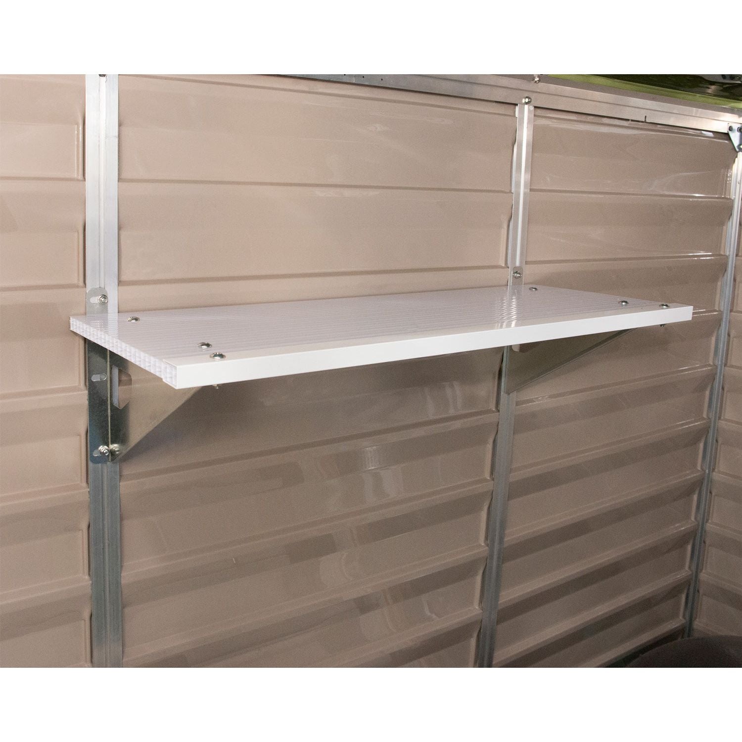 Maximize your storage capacity with the SkyLight Storage Shelf Kit. This comprehensive kit includes a high-grade Polycarbonate 16 mm shelf, two galvanized steel brackets, and all necessary hardware. Clear valuable floor space and organize your shed efficiently. With a weight capacity of up to 30kg, it's designed to be mounted onto the aluminum frame of the SkyLight Shed Series for sturdy support and easy installation.