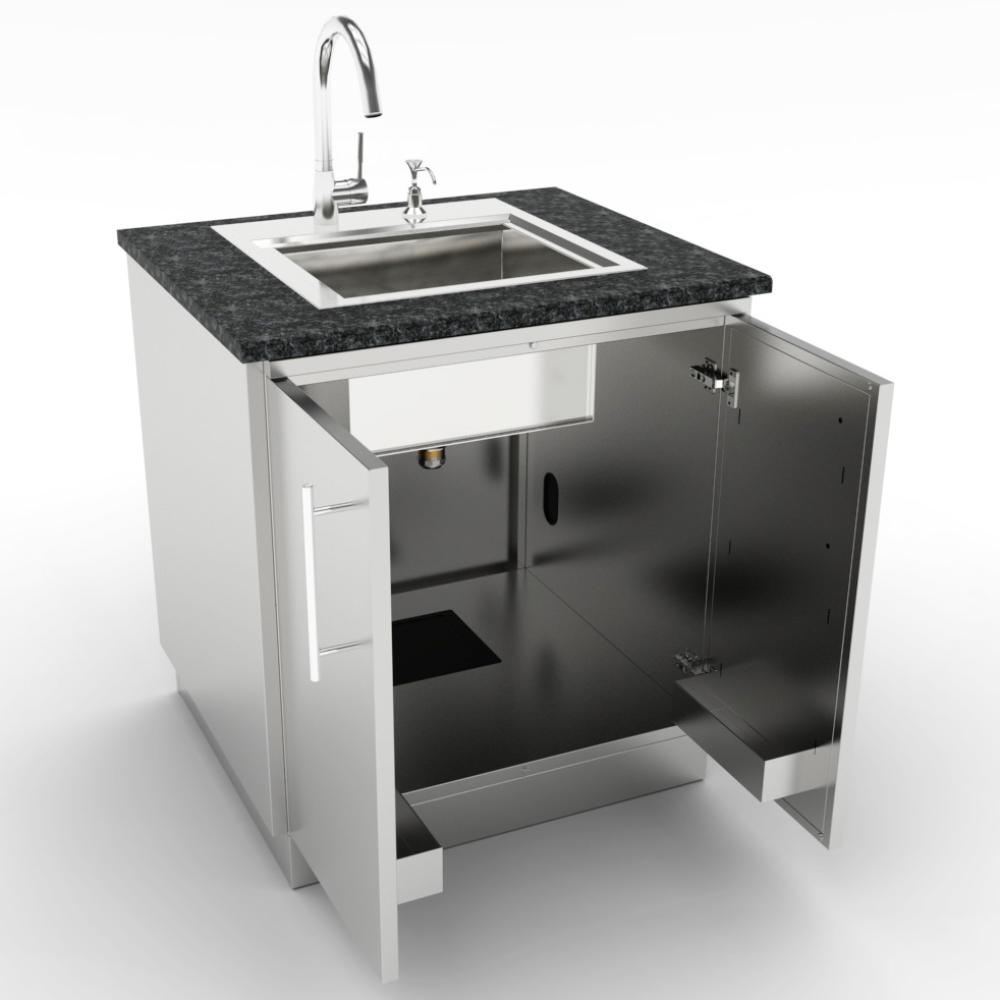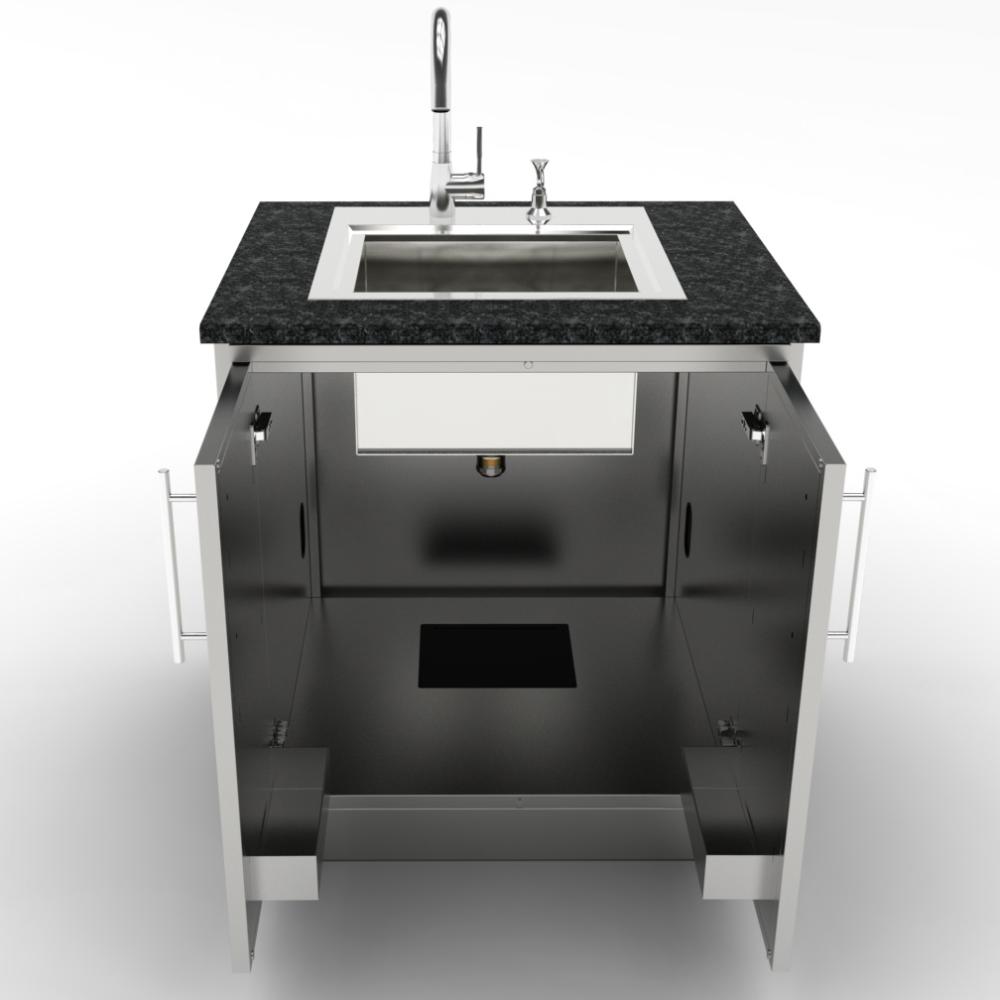 The Sunstone 30-inch full-height double door cabinet offers generous storage capacity and convenient accessibility. With its tall doors, this cabinet provides clear access to all stored items. Equipped with two removable shelves, it accommodates various sink or ice chest sizes, including the Sunstone standard sink or commercial-quality sink. Plumbing installation is made easy with the covered floor utility access hole. Additionally, the cabinet features two door pocket shelves that can be adjusted to three positions—high, middle, and low—for each door.