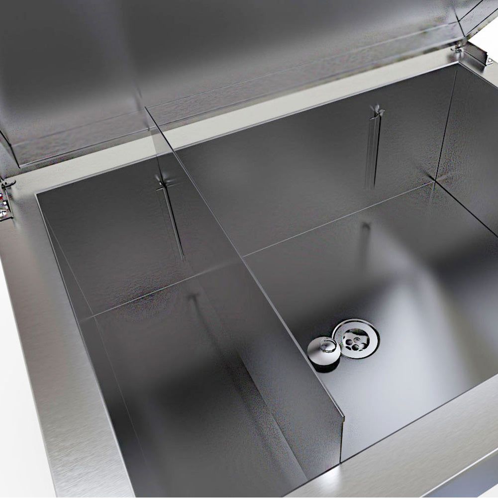 Introducing the Sunstone Ice Chest, an essential addition to your Outdoor Kitchen for serving chilled beverages and ice with style. Crafted from durable 304 stainless steel, this ice chest boasts a robust construction with 2.5cm thick double-walled sides, hood, and bottom, designed to withstand outdoor elements while maintaining optimal storage conditions for drinks and frozen treats.