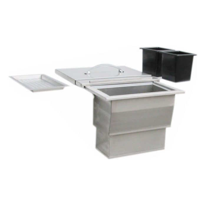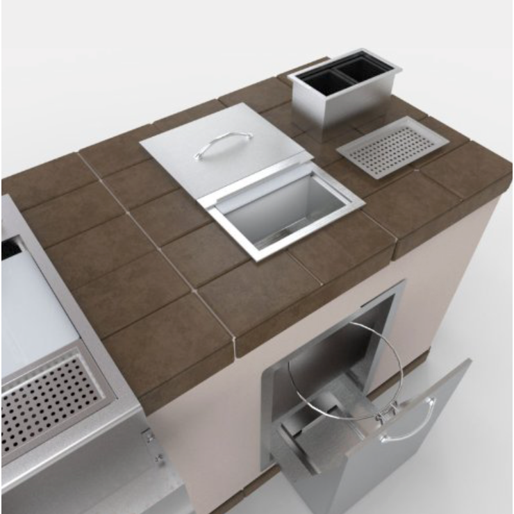Designed for practicality, the cover of the trash chute slides back effortlessly for quick access. Complete with essential features including a cutting board, drink tender, cocktail bins, and an ice bucket, this combo unit enhances functionality in your outdoor kitchen. Despite its compact size, it offers tremendous utility, making it a valuable addition to your outdoor cooking space.