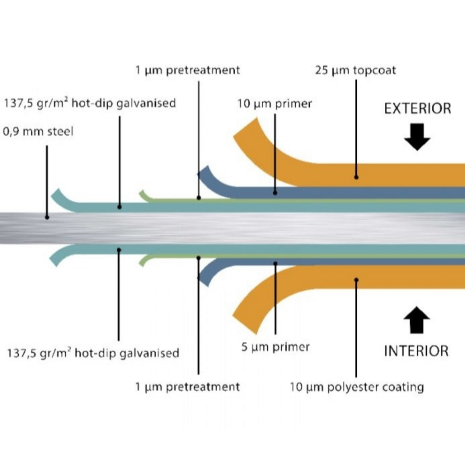 - Hot-dipped 0.9mm galvanized steel double-walled panels