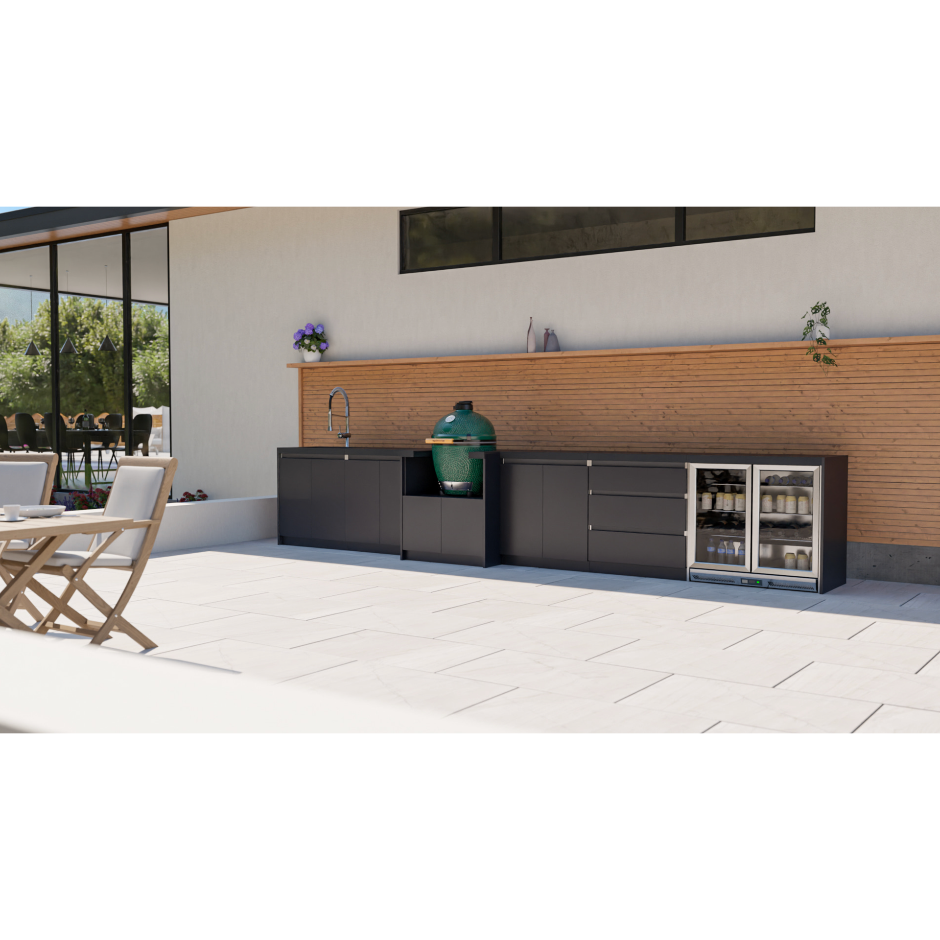 Constructed from high-quality 304-grade stainless steel and finished in a powder-coated black or grey, this kitchen is built to endure all seasons while maintaining a refined, polished look.