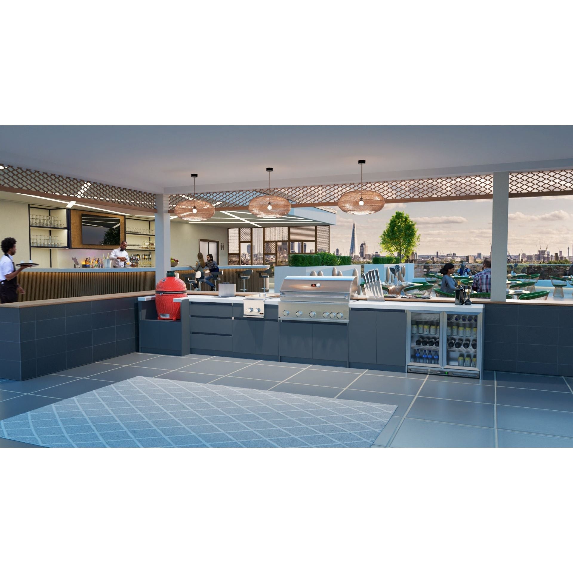 Durable and stylish, the Laminam surface features an Apple Peel finish on black units. This luxury Italian worktop resists heat, moisture, scratches, and daily wear—ideal for food prep and serving outdoors.